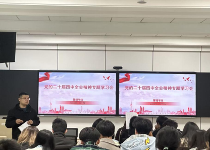 11月9日晚,学院党建与思政教育科组织团委、学生会主席团成员、各部门部长及各班级团支书、班长在立信楼404智慧教室召开党的二十届四中全会精神专题学习会。活动现场集中观看全会相关视频,共同学习《党的二十届四中全会公报》核心内容,重点围绕全会提出的“完善青年发展政策体系”“强化青年政治引领”等与学生密切相关的部署要求,结合习近平总书记关于青年工作的重要思想开展系统解读,充分激发同学们主动探究全会精神内涵的积极性,推动学生骨干先学深悟、做好示范。