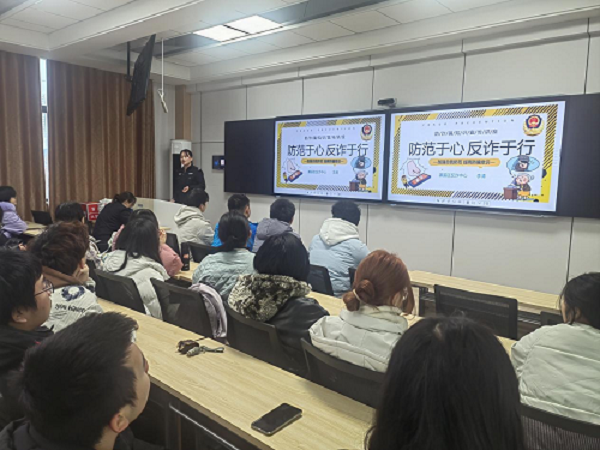 李警官在讲座中以“防范于心,反诈于行”为题,从“什么是电信网络诈骗”、“电信网络诈骗的形势”、“常见的电信诈骗类型”、“关于帮助信息网络犯罪活动罪”、“如何防范电信网络诈骗”五个方面给同学们做了精彩的讲解。讲座过程中还进行了有奖问答。