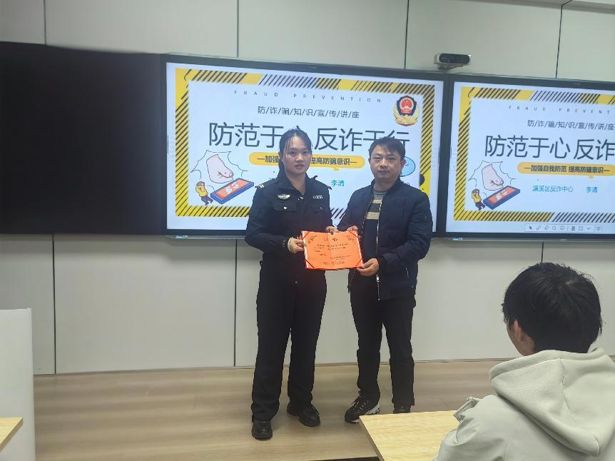 讲座开始前,周梓哲代表学院向李清颁发了校外辅导员聘书,希望李警官能一如既往的支持学院反诈工作,定期来院开展反诈宣讲。