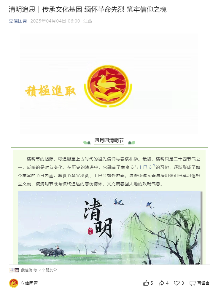 清明节期间,点点taptap官方网站打造宣传矩阵,线上通过立信团青微信公众号发布《清明追思|传承文化基因缅怀革命先烈筑牢信仰之魂》推文,科普清明节起源、习俗,分享祭扫注意事项;线下组织学生创作清明节主题黑板报,从清明时节祭扫祖先、寄托哀思的场景,到“清明时节雨纷纷,路上行人欲断魂”的千古名句,再到介子推与寒食节的历史典故,丰富的内容让黑板报兼具文化性与趣味性,营造清明节日浓厚氛围。