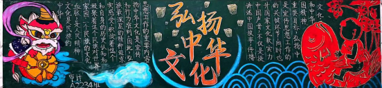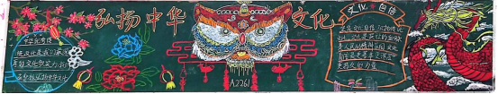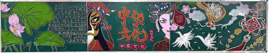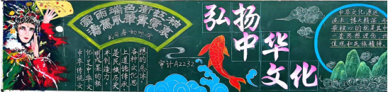 传统文化在心中,尺板方寸绘深情。各班认真组织,同学们积极参与,绘制出极具班级特色的中华优秀传统文化主题黑板报。各班级的黑板报主题鲜明,色彩搭配和谐自然,版面设计新颖独特,内容充实有吸引力,细腻的笔触镌刻下传统戏剧文化的绚丽篇章,艳丽的色彩绘制出民俗文化的绝美画卷,充分诠释了以爱国主义为核心的民族精神,充分展现了沉淀在国人心中的文化自觉与文化自信。