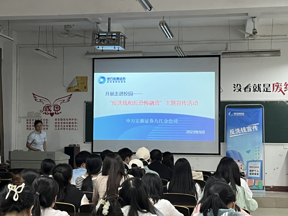 企业宣讲人员从申万宏源证券的历史沿革、行业地位、综合业务优势、公司组织架构、人才岗位需求、薪酬福利体系及工作时间进行了详细的讲解。宣讲中,还将“反洗钱和反恐怖融资”安全教育带进校园,提高了同学们对金融犯罪的认识和防范意识。