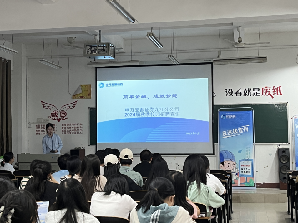 为拓展毕业生求职岗位,促进2024届毕业生高质量就业,9月21日,学院邀请申万宏源证券来校开展2024届秋季校园招聘宣讲活动,部分2024届毕业生参加。