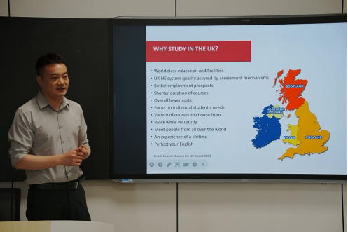 随后,英国切斯特大学中国办公室招生代表费中杨通过生动的视频和案例分享,展示了学校深厚的历史底蕴与现代化的教学设施。该校硕士项目涵盖多个学科领域,以其灵活的课程设置和国际化的教学模式吸引了在场学子的目光。该校通过跨国师资团队协作和海外实践模块,系统性培育学生的专业纵深与跨文化胜任力。