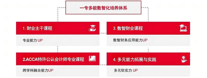 ACCA国际会计师证书聚焦新兴技术应用下财会专业学生的核心素养与技能,以当前全球大型企事业单位用人需求为导向,搭建起“财会主干课程+ACCA专业课程+数智财会课程+多元能力拓展与实践”的一专多能数智化培养体系,教学由浅入深、循序渐进,课程内容先进、覆盖面广、综合性强。聚焦会计、金融、财务管理、智能财务应用等学科交叉领域,旨在培养熟练掌握国内外会计、审计准则及相关法规,精通财经英语与智能财务应用,熟悉商业运行整体逻辑,具备跨学科整合能力、全球化视野与前瞻思维,综合素质拔尖的未来型数智财会人才。