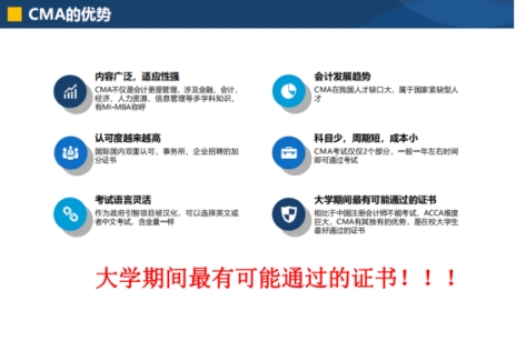 CMA着重战略管理技能,令你在财经内外游刃有余。CMA会员担任着重要的商业角色:商业分析师,管理咨询和项目经理;CMA会员也胜任运营、IT和商业企划等领域的高级职务。