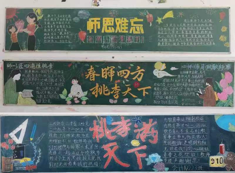 各班级以庆祝教师节为主题,绘制了精美的黑板报,板报内容生动丰富,情感真挚,构思巧妙精致,都表达着同学们对老师深深的感激之情,是学院团员青年送给老师最好的礼物。