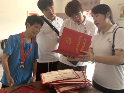实践队前往九江市柴桑区城门街道红旗村和白合村,实地走访慰问老党员,从党员先辈的事迹中汲取奋进力量。在白合村村委,老党员陈明钦向大家分享了八九十年代坐火车外出为村民购买药品、雪天半夜给村民入户问诊等艰辛历程,并鼓励同学们要能吃苦、肯奋斗,“要有吃苦精神,才有以后的发展。”