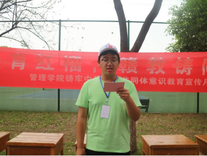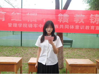 活动现场氛围庄重而热烈,主持人周慧莉向在场同学们阐述了本次活动的背景与意义,回顾了80年前中华儿女在抗日民族统一战线旗帜下众志成城、浴血奋战的光辉历程,指出了伟大抗战精神对铸牢中华民族共同体意识的重要作用。随后,学生代表龙腾结合抗战历史与新时代青年使命上台发言,号召全体同学铭记先辈牺牲、增进民族交流融合,并宣读了《铸牢中华民族共同体意识,传承伟大抗战精神倡议书》,引发广泛共鸣。倡议结束后,主题签名环节正式启动,同学们在印有“红土育红榴・赣教铸同心”的横幅上郑重签名,用实际行动表达对历史的敬畏与对民族团结的坚守。
