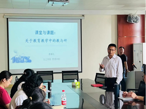 “教学与教研能力提升的关键在于保持匠心,需要瞄准某个教学问题持续深挖,同时要对教学所涉知识的前沿和动态密切关注。”讲座中,廖教授结合自己多年来的教研经验,分别从教学与教研的定位、教学与教研的关系、教学与教研能力提升的路径三个方面向在座的教师阐释了教学与教研的辩证关系,分析了教育研究、教学研究、教学成果的内涵和关系。同时,他还结合最近发布的江西省教育科学规划课题,向在座的教师交流了课题申报方面的经验与体会。