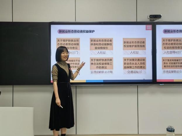 《经济法》课程是校级混合式一流课程和课程思政示范课程,教学资源建设充分。课程选取“新就业形态劳动者保障”作为切入口,将抽象法条转化为维权工具,体现出经世致用的教学导向。在课堂上,周骞老师设计了情景讨论、互动问答、分组案例等多种“以学生为中心”的教学形式,在对社会保险法核心知识点进行梳理后,结合社会热点问题,精选设计了“互联网企业996心理疾病工伤争议”“公务员突发疾病能否认定工伤?”“外卖骑手小蒙工伤认定案”等真实案例研讨,引导学生充分思考劳动关系界定、企业规避责任手段及法律救济途径。教学内容与时事热点、法治精神有机嵌合,学生在教师的引导下积极参与课堂互动,内化了对社会保险法的理解,提升了运用法律知识解决实际问题的能力。